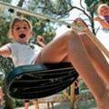 Open air playgrounds for children in the shade of the pine wood - with slides, see saw, swings
