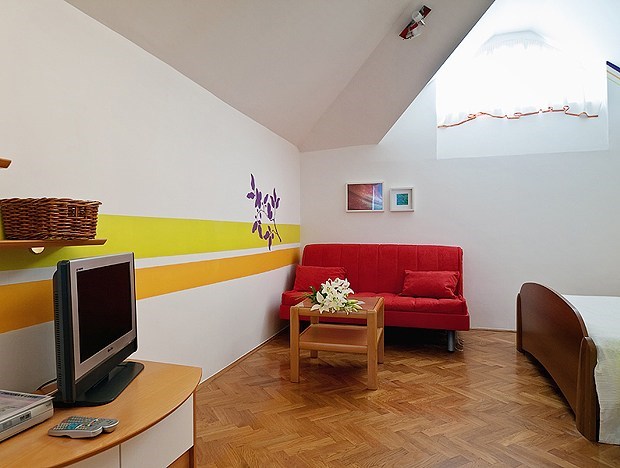 Soba se nalazi u mansardi kapaciteta 2 + 2 ,ima jedan spojeni krevet dimenzije 160 x 200 i dva odvojena kreveta 100 x 200.